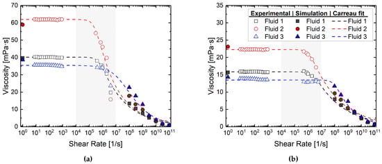 Viscosity as a function of shear rate from experiments at two different shear rate ranges (hollow symbols) and simulations (solid symbols) for the fluids studied at (a) 50 C and (b) 80 C. The dotted lines are the Carreau model fit to the viscosity profile of each fluid. The shaded region indicates the range of shear rates in the key lubricating gaps within the pump.