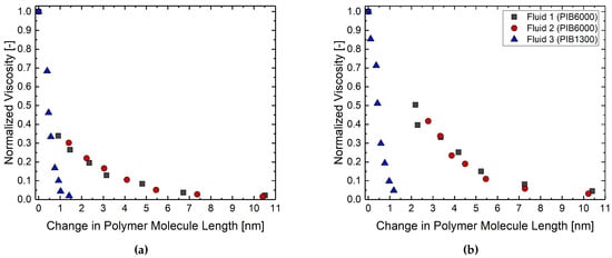 Normalized viscosity as a function of change in average polymer length in the direction of shear rate for the fluids studies here at (a) 50 C and (b) 80 C. Each point corresponds to a different shear rate.