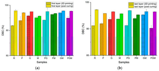 FT-IR spectroscopy was used to study the influence of the fillers on curing behavior. As the free-radical polymerization progresses, the concentration of the double bonds is decreased. Hence, the DBC provides a good estimate of the degree of polymerization (Dp) and the reactivity of the material []. After DLP 3D printing, the parts are usually not fully cured due to weak light emitted by the projector. Thus, the post-curing using a stronger UV light is required to increase the Dp. Nevertheless, it is desired that after the 3D printing, the parts already have high Dp and good mechanical strength to ensure a more robust manufacturing process. Since the first printed layers receive a larger dose of photons due to the long curing times and penetration of light during the curing of subsequent layers, the DBC on this side of the specimen is usually higher. The DBC of the samples is presented in Figure 1. After the 3D printing, all samples had relatively high DBC (above 80%). Monofunctional acrylates such as isobornyl acrylate used in this study are known to exhibit high values of DBC after the curing due to linear chain formation and delayed gel effect compared to the more crosslinked systems []. The DBC of the filled 3D printed samples were in general higher than DBC of the unfilled sample, except for sample PGM (measured on the side with the last printed layer). As expected, all samples had higher DBC on the side with the first printed layers. Otherwise, no clear correlations could be observed between the resin formulation and DBC of the 3D printed samples. After the post-curing process, the DBC conversion increased to values between 90% and 95%, which is a reasonable range for such systems. The DBC after the post-curing of the unfilled material was slightly higher than DBC of the filled materials. This effect was ascribed to the different light absorption properties of Sudan I dye and the fillers. The azo dyes such as Sudan I used in this study are well known to be prone to photocatalytic degradation and bleaching, thus reducing their light absorption capacity during the post-curing []. On the other hand, the solid lubricants, such as graphite and MoS2, are very UV stable. A consequence of this was that it was harder to fully cure the samples containing fillers in comparison to a sample containing only a dye.