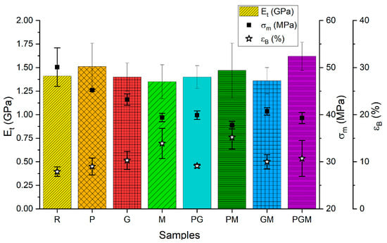 Mechanical properties of the material play an important role in the tribological performance of the system. Tribological properties, such as µ and ws, are well correlated to the mechanical properties [,]. Furthermore, when parts are used in tribological applications, such as gears, the material must withstand high mechanical loads during the transmission of power. The tribological contact represents a very complex loading situation combining tensile, compression, and shear stresses in the contact area. Nevertheless, the tensile tests provide good insight into the influence of fillers on the mechanical performance of the material. The addition of fillers into photo-curable resins can influence mechanical properties by the direct effect of the filler particles with specific properties (shape, size, modulus, etc.) or by influencing the photo-curing behavior of the resin. Figure 2 summarizes the tensile properties of the tested samples. The addition of fillers did not significantly (α = 0.05) affect the tensile modulus (Et) except for the sample PGM, which had slightly increased Et. For all filled materials, the tensile strength (σm) decreased. This effect was ascribed to the low interfacial strength between the matrix and the fillers, and the lower Dp of the filled samples (discussed in more detail in Section 3.1). σm decreased from 50.1 to 45.2 MPa, 43.2 MPa, and 39.4 MPa, for samples R, P, G, and M, respectively. For the mixed filler systems, the σm was further decreased to 39.9, 37.8, 40.7, and 39.2 MPa for the samples PG, PM, GM, and PGM, respectively. It can be concluded that the fillers decreased σm in the order MoS2 > graphite > PTFE. For all filled materials, the strain at break (εb) increased from 7.9% to 9.0%, 10.3%, 13.9% for samples R, P, G, and M, respectively. This was ascribed to the lower Dp of the filled samples. For samples containing mixed fillers, no clear trends between the composition and the εb can be observed. It must be noted that samples with the highest εb values (sample M and PM) also exhibited the lowest DBC values after the post-curing process, indicating the lowest Dp. Decrease in the strength by the solid lubricants could be potentially reduced by using improved curing strategies, or by optimizing resins composition, for example, by using an acrylate-epoxy hybrid system, where parts could also be thermally post-cured or by optimizing current curing strategies.