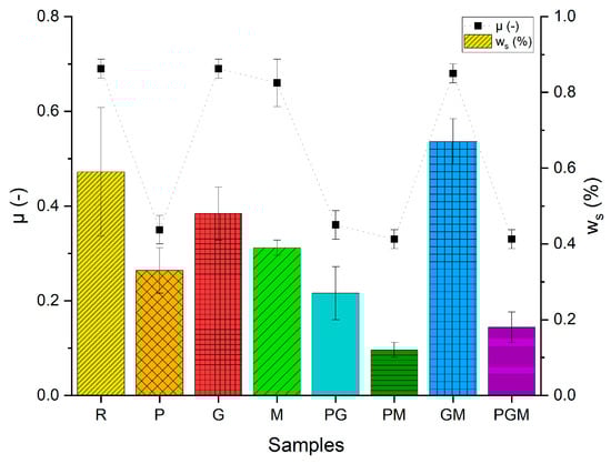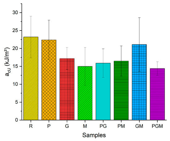 Photocurable resins for additive manufacturing are well known to be brittle, and the addition of fillers can further decrease the impact strength []. Thus, it is important that, for practical tribological applications, these materials have sufficient impact strength to endure the loads during the part operation. Figure 3 summarizes Charpy unnotched impact strength (acU) of the tested samples. The acU of the samples R, P, and GM was not significantly different (α = 0.05). The impact strength of samples G, M, PG, and PM decreased from 23.2 kJ/m2 for sample R to values around 16 kJ/m2 (±1 kJ/m2). Sample PGM exhibits the lowest value of acU (14.4 kJ/m2). On the first look, one of the biggest disadvantages of VPP technologies compared to thermoplastic-based AM is certainty low impact strength, since engineering thermoplastics, such as polyamides, exhibit higher acU than around 20 kJ/m2, as reported for the resins in this study. While an advantage of thermoplastic-based technologies is obvious at first glance, it must be noted that this may not always be true, especially since parts produced using material extrusion AM are well known to exhibit high levels of anisotropy, while VPP-produced parts are more or less isotropic [,]. Moreover, in recent years, great efforts have been made to overcome these challenges. Considerable progress comes from developing new materials on one side, and on the other side new technologies, such as Hot Lithography, which enables the VPP of highly viscous resins, resulting in parts with a higher impact strength [,].