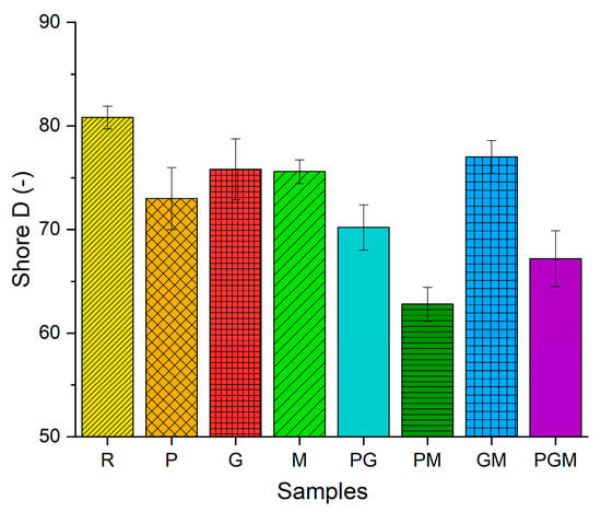 The hardness of photo-cured resins is dependent on many factors, all the way from photopolymer chemistry and structure, curing conditions, and fillers. As discussed in Section 3.1, the incorporation of a solid lubricant has a significant effect on the curing behavior of the resins, usually resulting in lower DBC conversion and, thus, lower Dp. The other main effect of solid lubricants on the hardness comes from the direct effect of solid lubricants. When soft PTFE (Shore D ≈ 55) is incorporated into relatively hard resin, this will result in lower hardness. The effect of the graphite and MoS2 on the hardness of the resins is a bit harder to predict (except on the curing behavior) since both fillers can increase or decrease the hardness of polymer systems [,,]. In Figure 4, all Shore D hardness values are illustrated. Sample R exhibited the highest hardness (Shore D ≈ 80), followed by samples GM, G, and M, where hardness was slightly lower (Shore D ≈ 75). On the other hand, the samples containing PTFE exhibited significantly decreased hardness, where Shore D of sample R was, while, for the samples PG, PGM, and PGM, the hardness was further decreased to Shore D values of 70, 67 and 63, respectively.