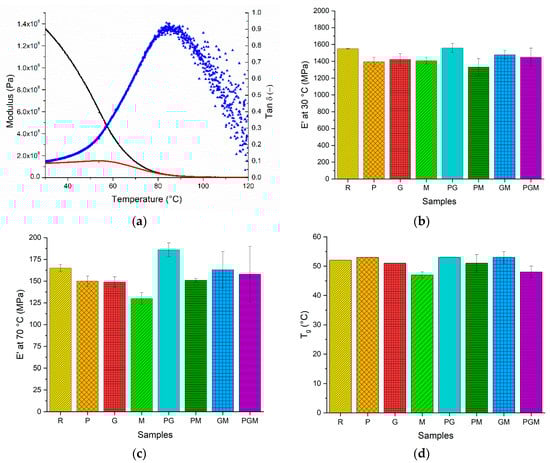 Dynamic mechanical properties of the unmodified resin and resins modified with different solid lubricants (PTFE, graphite and MoS2): (a) dynamic mechanical analysis (DMA) thermograms of the PTFE-filled resin (storage modulus—black curve, loss modulus—red curve, tan delta—blue curve); (b) storage modulus at 30 °C; (c) storage modulus at 70 °C; (d) glass transition temperatures.