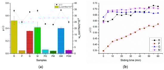 Two different testing methods were conducted, first to gain general information about the material behavior and second about the application’s relevant performance. The 250 mm/s unidirectional rotating tests should provide general information about the material behavior, whereas the 500 mm/s cyclic test imitated the application case–drive system for automatic doors. The tribological properties of samples determined using a unidirectional test are presented in Figure 6a. It is obvious that PTFE had the highest effect on the tribological behavior of the 3D printed specimens. All samples containing PTFE exhibited a decrease in µ from values around 0.7 to around 0.5. Samples containing only graphite and MoS2 exhibited similar average values of µ as the unlubricated material. A similar trend was also given for the ws, where all samples containing PTFE exhibited an enormous decline in ws from around 2.5 × 10−7 cm3/Nm to values ranging from 2.0 × 10−8 cm3/Nm to 3.0 × 10−8 cm3/Nm, which is a decrease in order of magnitude. Samples containing only graphite and MoS2 exhibited just a small decrease in ws to the values of 1.8 × 10−7 cm3/Nm and 2.0 × 10−7 cm3/Nm, respectively. When looking at Figure 6b, where the µ is presented as a function of sliding time, it is evident that despite the similar average values of µ for samples R, G, and M, the friction development was different. At the beginning of the tests, the µ of samples R, G, and M was in the same range at values around 0.6. The µ of sample R slowly increased over time, whereas the µ of samples G and M quickly increased up the testing time of 5 min, then a more or less steady state was observed. The samples G and M had a lower curing degree and thus also lower modulus, strength, and hardness. At the beginning of the test, when transfer films were not well developed, the harder sample R had lower µ, but, towards the end of the test, the µ of sample R surpassed the µ of samples G and M. On the other hand, PTFE-filled samples exhibited different development of friction, where the µ was much lower and constantly increasing over time at a similar rate. This was ascribed to the quick development of PTFE transfer films that enabled low friction sliding of the pin over the steel counterpart. As the test progressed, the temperature of the specimen was slowly increased, resulting in a decrease of modulus and hardness and an increase in µ.