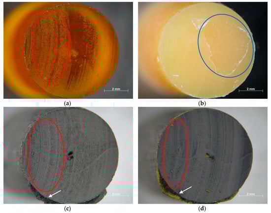 Optical micrographs of pins after a cyclic test at 500 mm/s: (a) reference resin; (b) PTFE-filled resin; (c) graphite-filled resin; (d) PTFE and MoS2-filled resin.