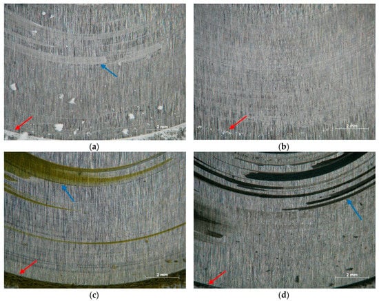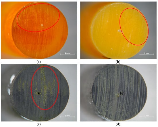 Optical micrographs of the pins after the unidirectional test at 250 mm/s: (a) reference resin; (b) PTFE-filled resin; (c) graphite-filled resin; (d) MoS2-filled resin.