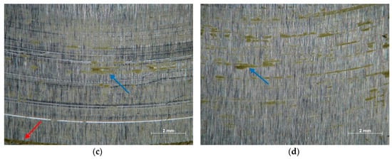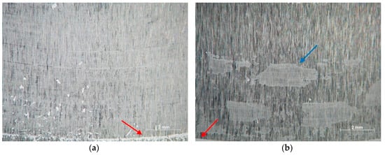 Corresponding counterparts presented in Figure 8 further confirm that, for samples without PTFE, both adhesive wear and abrasive wear were present. The regions highlighted with blue arrows had thick transfer film strips present at the counterpart surface. Contrary to thermoplastic materials, thermosets, such as acrylates used in this study, do not melt. Furthermore, thermoset materials are usually harder and exhibit much less plasticity than results in a lower possibility of effective transfer film formation. Nevertheless, most studies report the development of thermoset transfer films when sliding against hard surfaces, such as steel. Samples containing PTFE developed much thinner transfer films with no thick material strips. Thin transfer film has a much higher contact area compared to the area between material strips and the pins, resulting in a higher load transfer capacity. It is well known that PTFE can be easily pulled out of the matrix and deposited on the counterpart in a form of thin third-body transfer film, which reduces the µ and ws by providing low adhesion between the different surfaces. In contrast, the adhesion between thermoset material strips and the specimen is much higher since both materials have the same surface energy and thus strong interactions, resulting in high adhesive wear. A high amount of wear debris (red arrows in Figure 8) was present at the counterparts of samples without PTFE, while counterparts of PTFE-filled samples had only traces of the wear debris present at the counterparts.