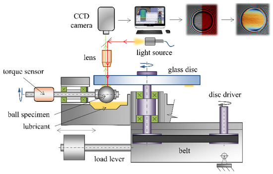 The experiments were conducted for two ball specimens with different surface roughness. The balls with 25.4 mm in diameter made of bearing steel AISI 52100 were modified by polishing using diamond pastes with different grain sizes. The root-mean-square (RMS) roughness values were measured at ten points all over the ball circumference using 3D optical profilometer; the variations are presented as standard deviations in Table 1. The in-situ measurements were carried out on a ball-on-disc rig. The rig scheme is shown in Figure 1. In this rig, the concentrated EHL contact is formed between a ball specimen and a flat transparent disc made of optical glass. The transparent disc allows an insight into the contact area and the film thickness distribution measurement. The rig uses a thin film colorimetric interferometry technique, which allows determining the film thickness distribution over the whole contact area; this technique is described in detail elsewhere [30]. The glass disc is optically smooth with RMS = 0.5 nm. The ball and the disc are driven separately by servomotors to set different rolling-sliding conditions. The friction was measured simultaneously with the film thickness by a built-in torque sensor, which is mounted between the servo motor and the ball shaft.