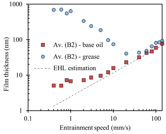 The film thickness measurements were conducted for both lubricants listed in Table 2. Each lubricant was measured for both B1 and B2 ball specimens to establish the effect of surface roughness. Figure 2 and Figure 3 show a comparison of the grease (blue dots) and the base oil (red squares) film thickness developments as functions of entrainment speed; both axes are in a log scale. The corresponding film thickness estimations based on the Hamrock–Dowson formula for EHL circular contact [32] were included in each plot. The estimations were based on the base oil properties listed in Table 2.