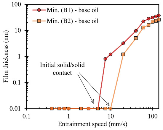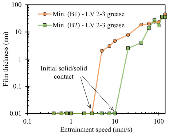 In the case of base oil, the film thickness corresponded fairly well with the estimations. A deflection occurred at low speeds around 1 mm/s for B1 and 7.5 mm/s for B2. The deflection was considered to be a consequence of a solid to solid contact. This was clear from the minimal film thickness shown in Figure 4 for B1 and B2 specimens. The zero value was replaced by 0.01 because of the log-log scale in Figure 4.