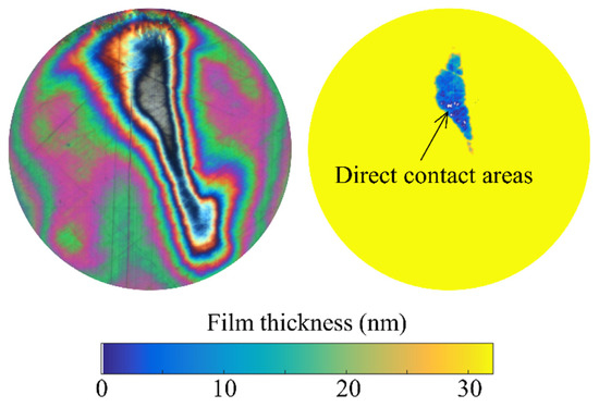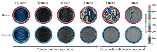 In the case of grease, a significant deflection from the linearity was also visible at low speeds. The deflection from the linearity occurred at higher speeds than in the case of base oil. There was a significant increase in the average film thickness for both ball specimens beginning around the entrainment speed of 20 mm/s, which corresponded with approximately 40 nm of the average film thickness. Such film thickness behaviour is typical for lithium grease, and it was observed in numerous previous studies [14,29]. A more detailed examination of interferograms revealed that the film thickness increased because of the thickener lumps in the contact area (Figure 5). At the speed of 20 mm/s, the thickener lumps started to enter into the contact and locally increase the film thickness. It resulted in higher average film thickness. The observed deflection seemed to be the same for both ball specimens; it indicates that the film thickness was thick enough to have an effect on the thickener entering, so, surface roughness did not have a major influence on the thickener entraining into the contact.