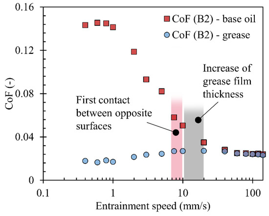 Friction was measured simultaneously with the film thickness for both ball specimens. Figure 8 and Figure 9 present a comparison of the friction for the grease (blue squares) and the base oil (red squares) and both ball specimens. Each friction value was obtained as an average value of one-second running and an average from four measurements to obtain friction representative for a whole surface around the ball circumference. The comparisons show that the frictions for the base oil lubricated contact and both ball specimens were almost the same (Figure 8 inset) at entrainment speeds above 40 mm/s. The friction of the grease also corresponded with the base oil at higher speeds quite well; this was because of the major influence of base oil properties as it was mentioned above. This can be seen in Figure 5, where no thickener in the contact area was detected. The film thickness remained thick enough to suppress the effect of different surface roughness. The major differences in friction between the grease and the base oil lubricated contact occurred at speeds below 40 mm/s. The base oil friction rapidly increased, whereas the grease friction remained almost the same. In the case of grease, there was no significant friction increase. The thickener entrance to the contact area could explain such behavior (Figure 5). It resulted in friction reduction, which remained very low. On the other hand, the base oil friction increased significantly for both ball specimens. The base oil friction exhibited an earlier increase, and it also reached higher friction values for B2 ball in comparison with a smoother B1 ball. According to the mixed lubrication theory, this steep increase in friction should be caused by the initial solid to solid contact between opposite surfaces [18]. However, the minimal film thickness indicates that the contact occurred at lower speeds. This can be seen in Figure 8 and Figure 9, where the areas of the solid to solid contact between opposite surfaces are highlighted. The same phenomenon was observed in the author’s previous study for other mineral base oil [20].