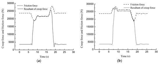 Comparison between the resultant creep force and friction force, R = 600 m (a) for low rail, and (b) for high rail,