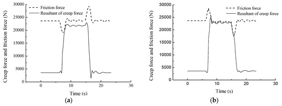 Figure 2, Figure 3, Figure 4 and Figure 5 show comparisons between the resultant creep force and friction force when the vehicle negotiates curved tracks. From Figure 2a it can be seen that the creep force between the inner wheel of the leading wheelset of each bogie and low rail is saturated and that the creep force between the outer wheel of the leading wheelset of each bogie and high rail is approximately saturated when the vehicle negotiates a curved track of radius 250 m. It should be noted that since SIMPACK only obtained the numerical solution of the vehicle curve negotiation, not the analytical solution, there is always an error between the numerical and analytical solutions. In Figure 2, Figure 3, Figure 4 and Figure 5, the resultant creep force is not exactly equal to the friction force. The author assumes that if the relative error between the resultant creep force and friction force is less than 5%, the creep force is considered to be saturated. It can also be also seen that the creep force between the inner wheel of the leading wheelset of each bogie and low rail is not saturated clearly when the vehicle negotiates a curved track of radius 600 m. From Figure 2, Figure 3, Figure 4 and Figure 5, it can be concluded that the creep force between the wheel and low rail changes from a saturated state to an unsaturated state with increasing radius of curved tracks.