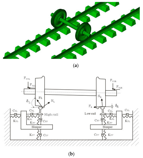 Finite element model of the wheelset-track system on a tightly curved track: (a) finite element model and (b) wheel–rail contacts. In the Figure, NL and NR represent normal contact forces. FL and FR stand for lateral creep forces. δL and δR represent contact angles. KRL and CRL represent lateral stiffness and damping of a single fastener. KRV and CRV stand for vertical stiffness and damping of a single fastener. KSL and CSL represent lateral support stiffness and damping of the subgrade. KSV and CSV stand for vertical support stiffness and damping of the subgrade.