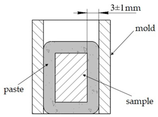 The components were pre-kneaded with organic binder and acetone until achieving a slurry composition. The acquired slurry (paste) with the steel samples inside it were placed in cylindrical molds and tamped, as shown in Figure 1. After that, the molds were emptied and the briquettes were drained for one hour at 100 °C in a drying oven. Then, the briquettes with steel samples positioned inside were exposed in the following time-temperature parameters: 2 h exposure and 1050 °C heating in a muffle furnace without a protective atmosphere. It is important to place the briquettes into the preheated at 1050 °C furnace at the beginning of the process. Cooling was conducted in still air at ambient temperature, where the cooling rate was measured as 3 °C/s.