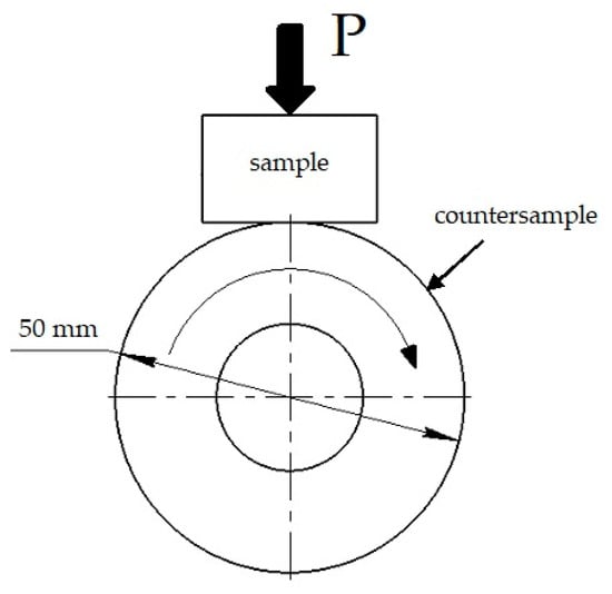 The wear test was conducted in accordance with the block-on-ring scheme with dry sliding friction on friction machine SMTs-2 (Figure 2). The sliding speed was 0.8 m/s (n = 300 min−1) and the contact pressure (P = 6.86 N/mm2). A hardened disk of high-speed steel R6M5 (analog to AISI M2 high-speed steel) with a hardness of 63 ± 2 HRC was used as a roller (ring). The tested samples were previously borided and boroaluminized in accordance with the aforementioned modes. The bare steel and steel samples after hardening were subjected to the test for comparison. The sample’s wear behavior was determined by its mass loss, on an analytical scale with an accuracy of ±10−4 g. Due to the significant difference in surface hardness and, consequently, mass loss, it was decided to weight bare and heat-treated steels every minute, and borided or boroaluminized ones every 5 or 10 min. The worn surfaces were examined using SEM after the test finish.