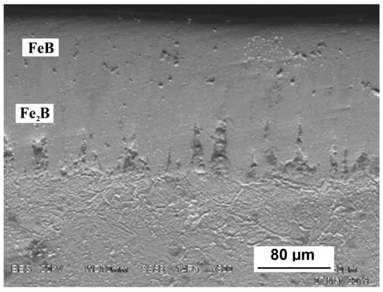 SEM image of borided steel H21 after 2-h exposure at 1050 °C.
