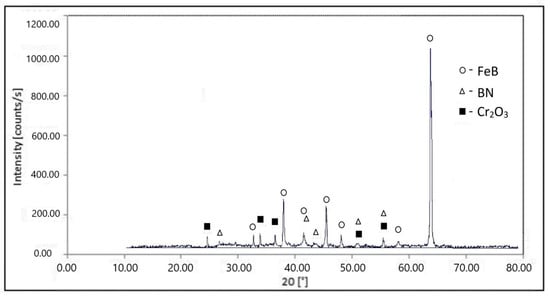 Boriding in a treatment paste at 1050 °C leads to the formation of layers with a tooth-like microstructure (Figure 3). XRD analysis has shown FeB, BN, and Cr2O3 presence (Figure 4). The outer iron boride FeB is normally accompanied by Fe2B as the inner phase on the border with the base metal. The latter phase, probably, was not detected due to insufficient X-ray penetration in the boride layer. Fe2B presence can be partially confirmed by metallographic and EDS analysis. The presence of BN can be explained by reaction with atmosphere nitrogen: