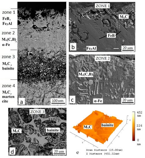 Microstructure of boroaluminized steel H21 treated at 1050 °C for 2 h, where (a) is the whole layer; (b–d) are magnified pictures of the layer zones 1, 2, and 3; (e) is the atomic force microscope (AFM) image of Zone 3.