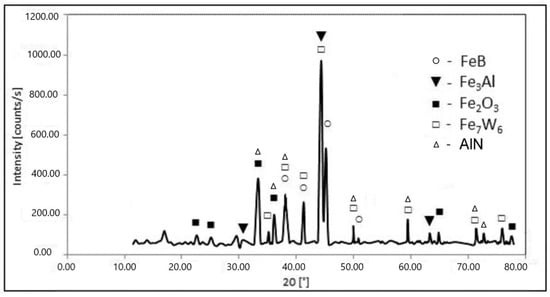 Metallographic analysis along with the EDS data has shown that each zone comprises two main phases with peculiar elemental composition and microstructure (Table 4). For instance, aluminum-containing phases such as Fe3Al (17.5 wt % of Al) and aluminum solid solution in α-Fe (10.35 wt % of Al) concentrate in the upper zones and play the role of the soft matrix. The former phase concentrates in Zone 1, while the latter in Zone 2. The XRD analysis confirms the presence of Fe3Al. Besides, other compounds were revealed such as Fe2O3, FeB, Fe7W6, and AlN (Figure 6).