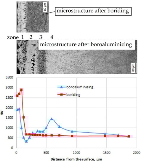 Microhardness of steel H21 after pure boriding reached up to 2900 HV0.1. Such elevated microhardness is due to iron borides alloying with W, Cr, and V. The microstructure complexity and phase diversity of boroaluminized steel result in microhardness profile variations, where maximum values correspond to iron boride and carbides zones, and minimum to Fe3Al in Zone 2.