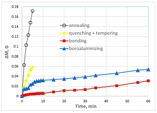 It is known that wear and plastic deformation are the main failure processes of hot forging dies []. The wear behavior of steel H21 shows that the samples after TCT are superior in wear resistance in comparison with the steels without diffusion layers on the surface (Figure 8). Both heat-treated (quenching followed by tempering) and bare steel have shown critical mass loss since the very beginning of the test and characterized by a sharp wear curve ascent. However, the former is more wear-resistant compared to the non-treated samples and the mass loss was measured as 0.06 g against 0.17 g after the five-min test, respectively. The continuing of the test was decided redundant for these samples due to intense mass loss and high wear rate.