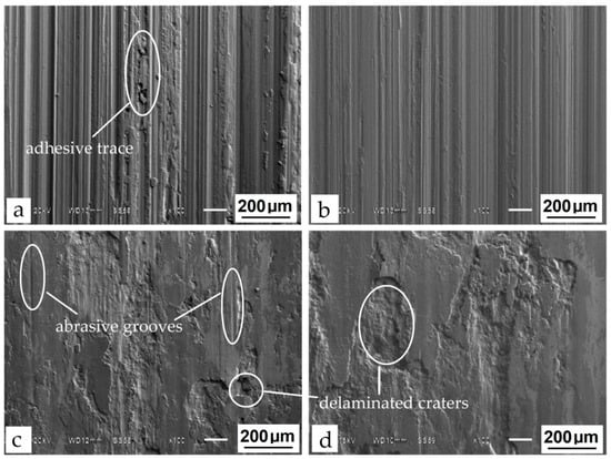 The wear mechanism on steel H21 differs significantly depending on the treatment. The abrasive grooves oriented to the sliding direction are visible on bare and heat-treated steel (Figure 9a,b). Such behavior is inherent in the abrasion wear mechanism []. At the same time, local traces of adhesive wear can be observed on bare steel, where abrasive grooves are crumpled or filled with a small number of particles. This indicates the first stage of material transfer, where the shear and rupture of adhesive junctions in asperities of tested material results surface damage.