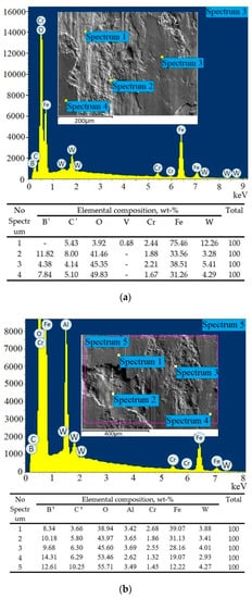 EDS analysis of worn surface after wear test has shown a high amount of oxygen on the borided sample (Figure 10a). The lowest oxygen content of about 3.9% was measured in the delaminated crater (Spectrum 1). The rest three spectrums have shown oxygen concentration from 41.4% to 49.8%. This means that oxidation wear takes place in addition to mentioned wear mechanisms. High contact pressure results in friction heating, which accelerates the formation of oxides on wear surfaces. The thickness of the oxide layer is uneven and its lowest value corresponds to elevated tungsten content accompanied by vanadium presence in the vicinity of Spectrum 1. According to [], the high wear resistance of heat-treated H21 steel is attributed to undissolved carbides Fe3W3C. Thus, both types of hard compounds-iron borides and carbides MxC (where M is Fe, W, Cr, V) contribute to wear resistance for borided steel.