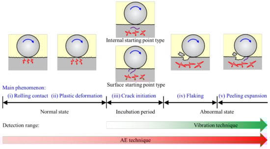 A technique based on vibration has conventionally been used to detect and diagnose damage to bearings []. However, this technique does not provide enough information to permit damage prediction, because it can only detect problems at a terminal stage such as when flaking or peel expansion occurs, as shown in Figure 1. On the other hand, an acoustic emission (AE) technique, which can directly evaluate friction and wear, is considered to be very effective in diagnosing the lifetimes of bearings. The AE technique is a diagnostic technique for detecting potential wear that involves analysis of elastic stress waves that occur when strain energy stored in a material is released as the material is deformed or fractured. Unlike the vibration technique, the AE technique can detect plastic deformations of surfaces and crack initiation during their incubation periods. The AE technique is therefore suitable for predicting the fatigue of bearings and for evaluating the mode of damage. Several studies have been conducted on the diagnosis of abnormalities in rolling bearings and in bearing steels by using the AE technique [,,,,,,]. However, most of these were based on a comparison between the operating time of the rolling bearing and changes in AE signals. As a result, it is difficult to clearly understand the cause of the abnormalities that occurred in the rolling bearings during the fatigue process.