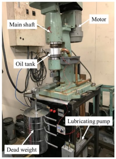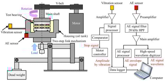 Figure 2 is a photograph of the bearing fatigue tester that was used in the bearing fatigue test. Figure 3 is a schematic representation of the bearing fatigue tester and the measuring system. A small wideband-type AE sensor (AE-900M-WB: NF Corp., Yokohama, Japan) was used in this study. The AE sensor was installed onto the holder near the bearing-installation section, so that elastic waves generated by rolling friction could be detected with high sensitivity. The AE amplification factor was set to 70 dB by a preamplifier (AE-912: NF Corp., Yokohama, Japan) and a main amplifier, and the background noise was eliminated by using a 20 kHz high-pass filter with a discriminator (AE9922: NF Corp.). A vibration sensor (GH-313A: Keyence Corp., Osaka, Japan) with a minimum detected acceleration of 0.98 m/s2 was installed near the AE sensor. Changes in amplitude of the AE signal were evaluated by using the envelope detection waveform from which the amplitude of the background noise component was subtracted. To examine changes in the frequency spectrum of the AE signal waveforms during the fatigue process in the rolling bearing, the AE signal waveforms were recorded by using a high-speed waveform digitizer and subjected to a fast Fourier transform.