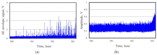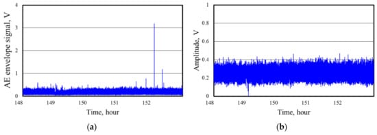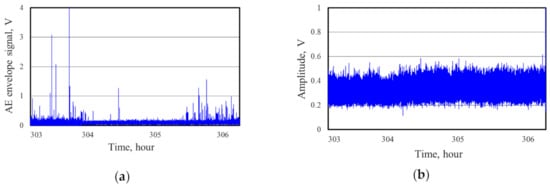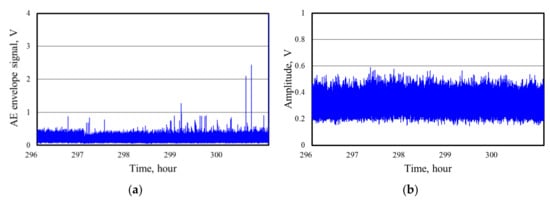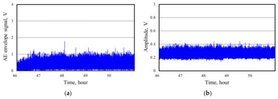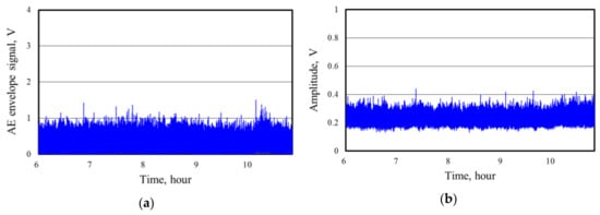 As the experiment required a long time, of the order of 400 h, only the experimental results identified as noteworthy are described below. Figure 4 shows the changes in amplitude of the AE signal (envelope detection waveform) and the vibration signal during the period from 6 to 10 h after the start of the bearing fatigue test. During this initial stage, there were no significant changes in the amplitude of either the AE signal or the vibration signal. Therefore, the lubrication conditions were ideal and no damage occurred. Figure 5 shows a typical AE signal waveform detected during this time period, together with the results of a frequency analysis. In the frequency analysis, a primary frequency peak appeared below 0.1 MHz. Since such a periodic wave of low frequency without distortion, as shown in Figure 5a, can be observed when a material surface is hit by hammering, it can be said that pure rolling contact and friction occurred between the surfaces. Throughout the experiments, as shown in Figure 5b, only the frequency peak below 0.1 MHz was observed during the initial stages of the tests, corresponding to the normal operating state.