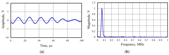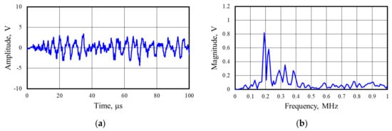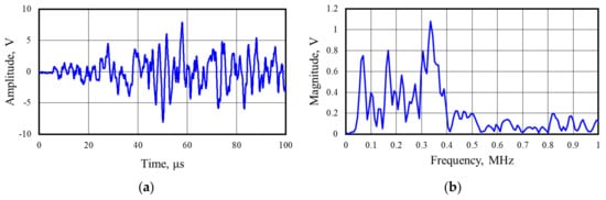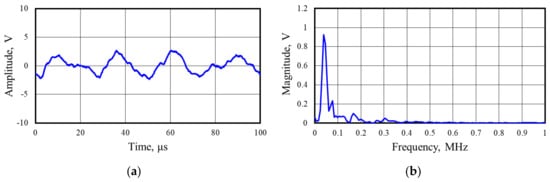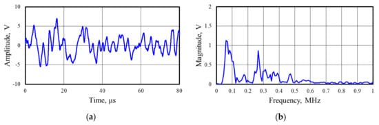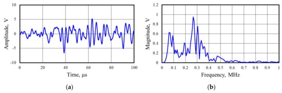 Typical AE signal waveform detected at around 300 h and its frequency spectrum: (a) AE signal waveform; (b) frequency spectrum.
