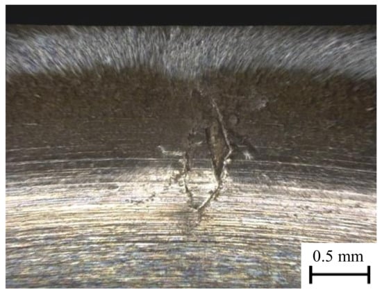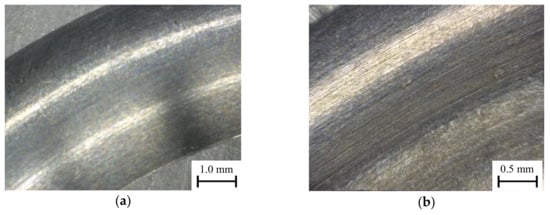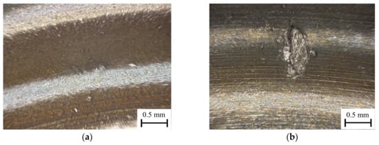 Figure 15 shows micrographs of the bearing raceway surface before (at about 300 h) and after (at about 306 h) the appearance of flaking on the shaft washer of the thrust ball bearing. The micrograph of the raceway surface presented in Figure 15a showed no significant change compared with the previous raceway surface, indicating that a satin-finished surface was formed over the entire friction track. On the other hand, in Figure 15b, flaking can be observed to have occurred at the center of the raceway surface.