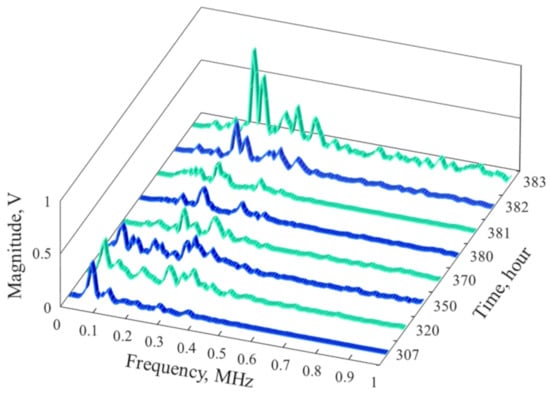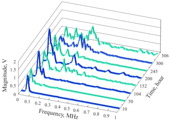 Figure 20 shows the change in the frequencies of the AE signal waveforms at various times until flaking occurred in the housing washer. As for when flaking occurred in the housing washer, the change in the frequencies was basically the same as that in the shaft washer, as shown in Figure 16. However, the magnitude of frequency peaked at about 0.3 MHz. A shift in the primary frequency, not to 0.3 MHz but to around 0.2 MHz, occurred from 370 h, although a large frequency peak at about 0.3 MHz also existed. Comparing the surface observations after flaking in Figure 15 and Figure 19, the difference in the high frequency peak may be related to the mode of crack initiation and its size. As discussed above, with the bearing damage, high frequency peaks started to appear in the AE spectra. Since various secondary AE events are generated during crack propagation [], the frequency spectrum may be complicated. Nevertheless, it is considered to be related to the nucleation of small defects whose size is proportional to the frequency because the AE spectra are accurate against deformation and fracture phenomena. In order to yield any findings about the frequency spectra, further experiments and consideration will be needed to interpret the numerical data obtained from this study.
