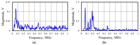Figure 21 shows the frequency spectrum of the AE signal waveforms obtained from indentation tests performed at two different applied loads. As shown in Figure 21a, when a low load was applied, a primary peak appeared at a frequency below 0.1 MHz; however, as shown in Figure 21b, when a high load was applied, in addition to the peak at a frequency below 0.1 MHz, another peak appeared at around 0.2 MHz. In both cases, the peak at about 0.1 MHz was considered to be related to plastic flow due to contact and friction between the indenter and the bearing race surface. This is similar to the feature in the AE frequency observed in the initial stages (normal state) of the bearing-fatigue test, as described in Section 3.1. This is because the collision (contact) and plastic flow of surface asperities also occur in the running-in process. A peak with a similar frequency has been confirmed to occur during sliding friction without wear [,]. In addition, microcracks might form at the corners of the indentation under a high applied load, so the peaks in the 0.2 to 0.3 MHz frequency region can be attributed to the generation and propagation of cracks in bearings. Similar features have been observed in other fatigue tests [].