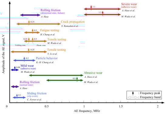 As proposed in a previous study [], the correlation map between the frequency spectra of AE signals and deformation and fracture phenomena (friction and wear modes) provides a very powerful tool for identifying and evaluating complex tribological phenomena. Consequently, the correlation map was updated to include the results of the present study, as shown in Figure 22. Here, the amplitude of the AE signal shown on the vertical axis is not an absolute value because many factors such as the AE measuring system and measurement conditions affect the sensitivity of detection. However, the trends in the frequency spectrum of the AE signal waveform are markedly dependent on the deformation and fracture phenomena rather than on the experimental conditions, because the velocity and scale of the phenomena chiefly decide the shape of the AE waveform (i.e., the feature of the frequency spectrum) [,]. Although the position of a peak in the frequency spectrum of the AE signals was slightly shifted, similar trends in the frequency spectrum to those observed in this study have been confirmed in an experimental study using a deep-groove ball bearing [].