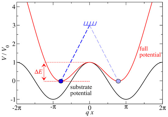 We now discuss the evolution of the probability distribution in the Prandtl model where is less than unity but still large enough for at most two minima in the total potential to occur at any given relative substrate position. (Allowing for more potential energy minima does not change final results in a significant fashion but requires a much longer discussion.) Moreover, assume that , where indicates that the maximum of the substrate potential coincides with the spring’s equilibrium position, as depicted in Figure 1. When the substrate has not yet reached the situation shown in Figure 1 such that the left minimum is lower than the right by a few , essentially all the probability of resides near the left minimum, i.e., near the one in which the dark blue atom is indicated. To what extent has shifted to the right minimum when left and right minima are close to each other, say within less than , depends crucially on the driving velocity . In the limit , the system is within the linear-response (Newtonian) regime and is very close to the equilibrium distribution for a given substrate position, i.e., . However, for this to occur, the mass point needs to equilibrate, i.e., it must overcome the barrier several times while the energy of the left minimum has been raised by a few compared to the right. The corresponding time to do so increases with the Arrhenius factor , where is the energy barrier that has been renormalized from due to the coupling of the (coarse-grained) atom to the spring, see again Figure 1. Assuming the prefactor of the equilibrium damping to be proportional to an inverse power of , we obtain