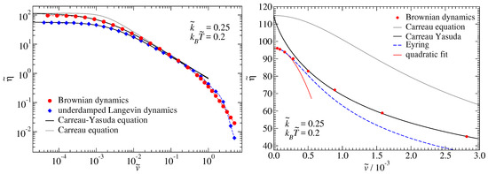 Similar to Figure 3, but for and . Parameters used in the Carreau–Yasuda equation are this time , , , and for the overdamped system and , , , and in the underdamped case.