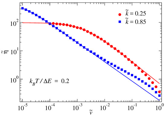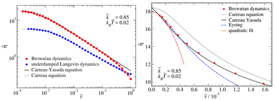 The adjustable parameters of the CY equation were fit to the data presented in Figure 3 within the range . Results for the fits are stated in the figure caption. The two dimensionless exponents n and a happen to be reasonably close to those reported by Yasuda for polystyrene [21,22]. Significant similarity between our results and Yasuda’s data on polystyrene is certainly also revealed by eye when comparing our Figure 3 to Figure 4.1-3 in Ref. [22]. We are certain that the agreement can be further significantly improved by slightly increasing and reducing , and, most importantly, by introducing a Stokesian damping between the mass point and the moving external potential. The last modification of our model would make the damping/viscosity level off at a finite value for large shear rates.