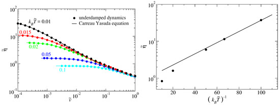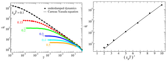 (Left) dependence in the underdamped Prandtl model for at various temperatures. Symbols show data from MD simulations, while lines are fits to the Carreau–Yasuda equation. The most extreme values for n and a turned out to be , at and , at . (Right) Reduced Newtonian damping as a function of inverse reduced temperature . Circles show results from fits of the MD data to the Carreau–Yasuda equation. The solid line is a low-temperature fit of the data to Equation (6), where is determined as described in Figure 1 with an exponent .