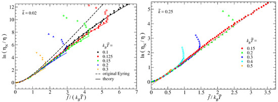 The data for reveals an astonishingly good agreement between simulation and the theory developed in Section 2.1.3 for the force-induced reduction of the effective free-energy barrier. These corrections are a function of the shape of the corrugation potential. They would therefore be different if the corrugation potential had a different functional dependence by including higher-order harmonics. The original Eyring theory, which does not include shear-force induced corrections to the free-energy barrier, provides an upper bound for the reduction , which is approached from below as T is decreased. The data for consolidates the claim that the Eyring model is obtained as a limiting case of the Prandtl model, even if is still not fully .