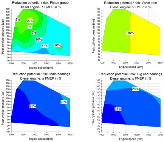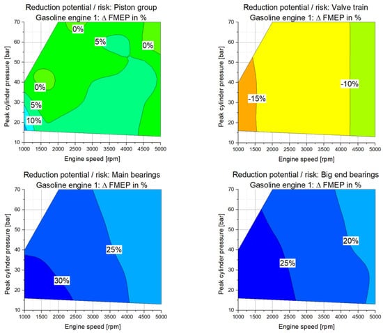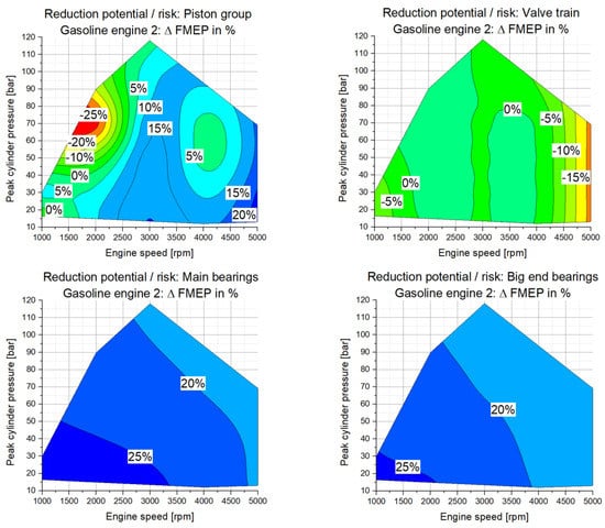 4]. At the base engine level, for example of gasoline engine 2, the arising risks are rather small between 0% and −2% at low engine speeds and high loads. However, when analyzing the friction reduction at the sub-assembly level (see