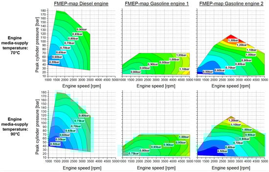 C, the friction reduction potential analysis can be performed not only at the sub-assembly level of the engines, but also at the global base engine level. This is done by subtraction of the FMEP results at the individual temperature level, and enables comparison of the global potential and risks at the base engine level. Subsequently, possible advantages using the presented combined approach are explained in detail. The resulting FMEP-maps at the base engine level of the investigated engine architectures are presented in