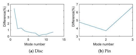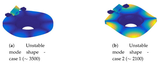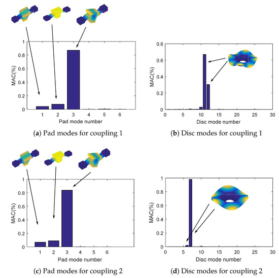 In order to find the contributions of free-interface normal modes in these unstable complex modes, the Normalized Modal Assurance Criterion (MAC) [40] between free-interface normal modes and these unstable complex modes is calculated. The expression of the MAC used here is given by Equation (6) in which is the unstable complex mode and is a free-interface normal mode. The axial dominant movement with no nodal circle for the disc and rotational movement for the pin contribute the most to these unstable frequencies as shown in Figure 7.