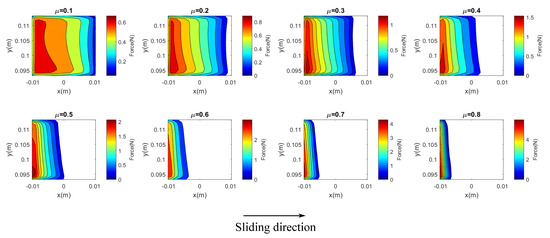 Distribution of contact forces on the contact area as a function of friction coefficient.