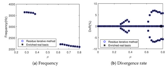 Using Equation (4) together with enriched real coupled basis, the complex modes corresponding to these steady full sliding equilibriums are computed. Their frequencies and divergence rates as a function of friction coefficient are presented in Figure 5.