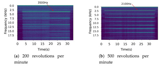 Typical experimental spectrogram(time-frequency) of acoustic pressure as a function of the rotation speed of the disc.