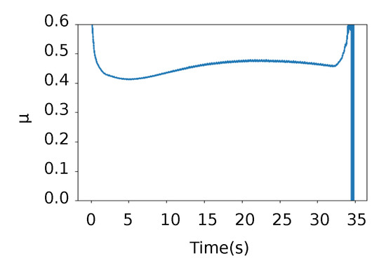 Example of measured apparent friction coefficient (averaged value over 2 ms) at the speed of 500 rpm (coupling 2 at 2100 Hz).