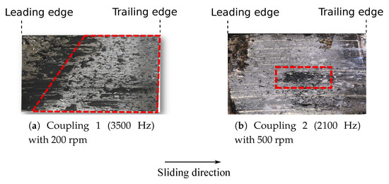 In order to localize real contact zone, 8 thermocouples have been inserted in the pin at 2 mm depth from the sliding surface. By using inverse method applied to temperatures measured by these thermocouples [43], a macroscopic effective contact zone could be identified. Pictures of the surface have also been recorded between the tests to confirm these contact areas. With the two speeds (200 rpm and 500 rpm), two distinct macroscopic effective contact zones have been identified and are shown in Figure 10. Approximation of these effective areas has been done by superposing two experimental information not detailed here: image analysis (variations from successive ones) and thermal analysis (several thermocouples have been introduced in the pin and infrared measurements of the disc surface, allowing to approximate the heating areas). Note that the contact is not localized at the leading edge as in the numerical results of Figure 4 which is due to experimental initial conditions. These localizations appear almost systematically with speed variations. Localization around the pin center at high speed (500 rpm) can be explained by thermal dilatation which becomes dominant with a curved global shape of the pin when the temperature increases. This contact surface variation systematically leads to frequency shifting from 3500 Hz to 2100 Hz. Thus, it can be concluded that squeal frequency is correlated with specific contact zones.